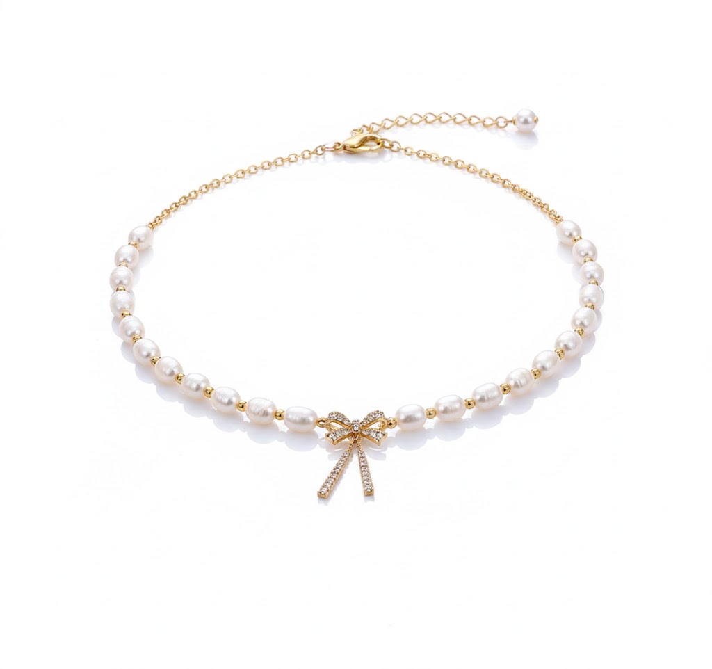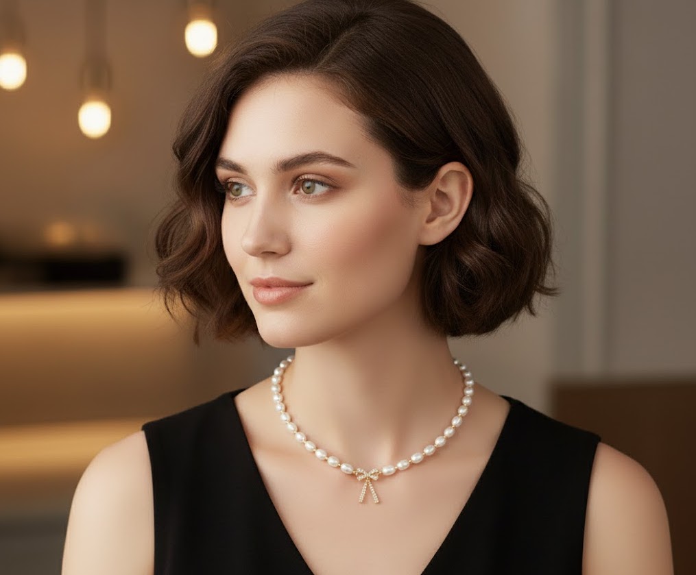 愛らしいリボンモチーフを中央にあしらい、上質アコヤパールを贅沢に連ねたエレガントなネックレス。リボン部分には緻密にセッティングされた天然ダイヤモンドが輝き、フェミニンな印象の中に上品な高級感を漂わせます。