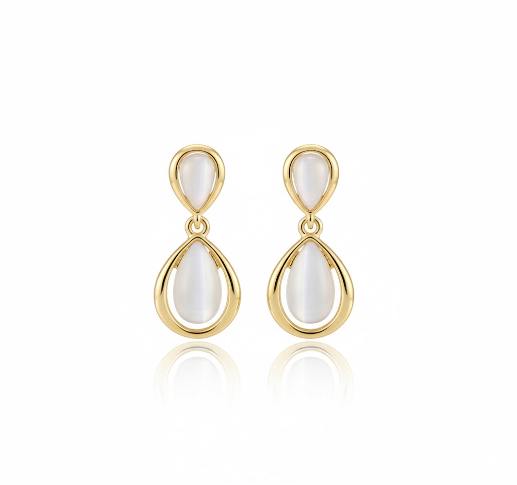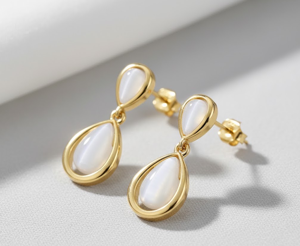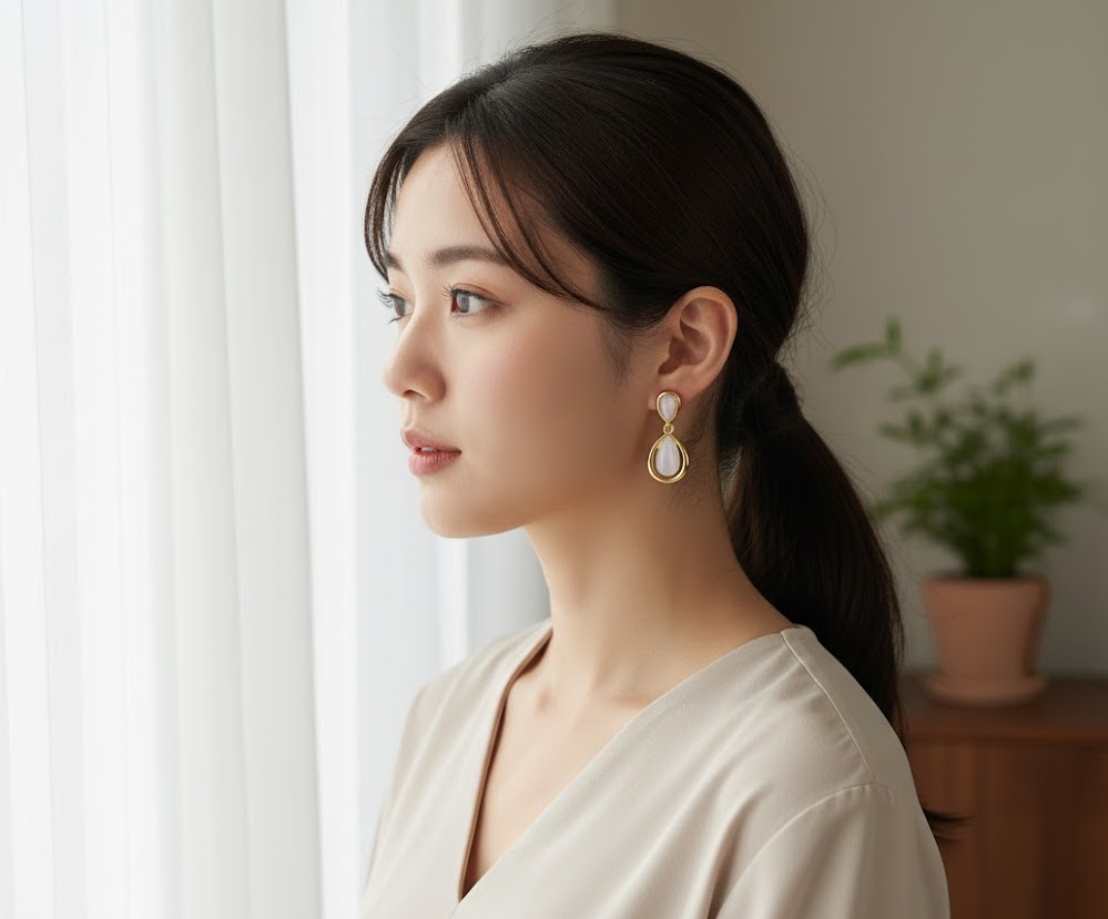 マザーオブパールが揺れる上品なK18ドロップピアス。柔らかな艶が魅力。