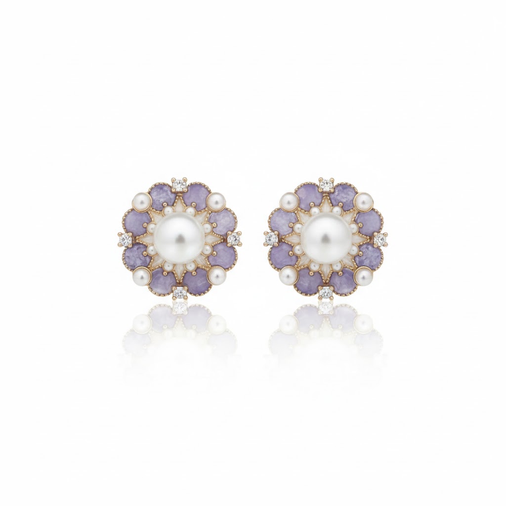 ラベンダーカラーのジェイドを花びらのように配し、中央に高品質アコヤパールをセットしたロイヤルデザインのフラワーピアス。淡い紫が上品に発光し、パールの光沢とのコントラストが格調高い印象を与えます。