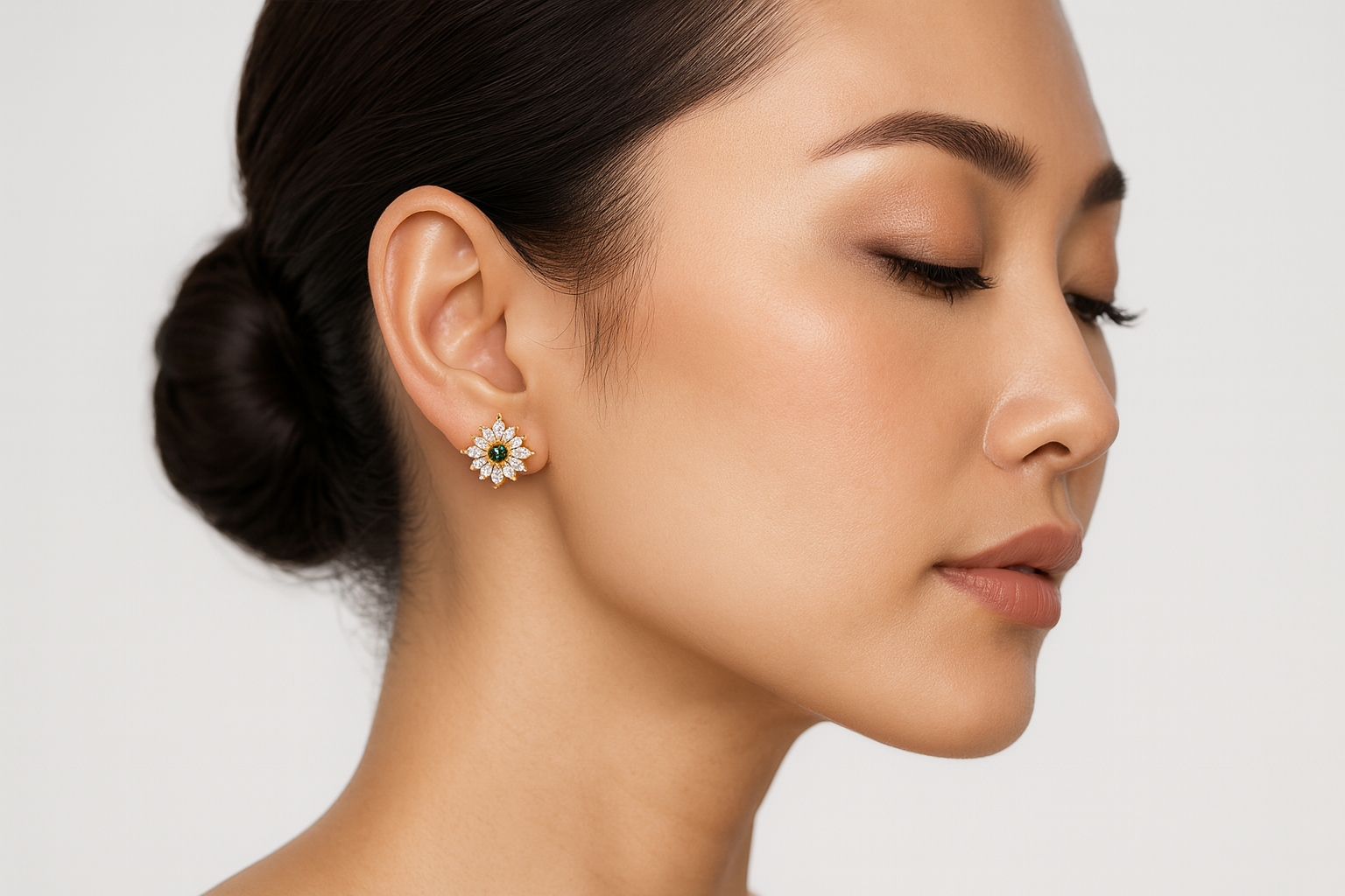 マーキスカットダイヤモンドを贅沢に放射状に配置し、光を最大限に取り込む立体的なデザインが特徴。中央のラウンドエメラルドが全体を引き締め、上品でクリーンな印象を演出します。
