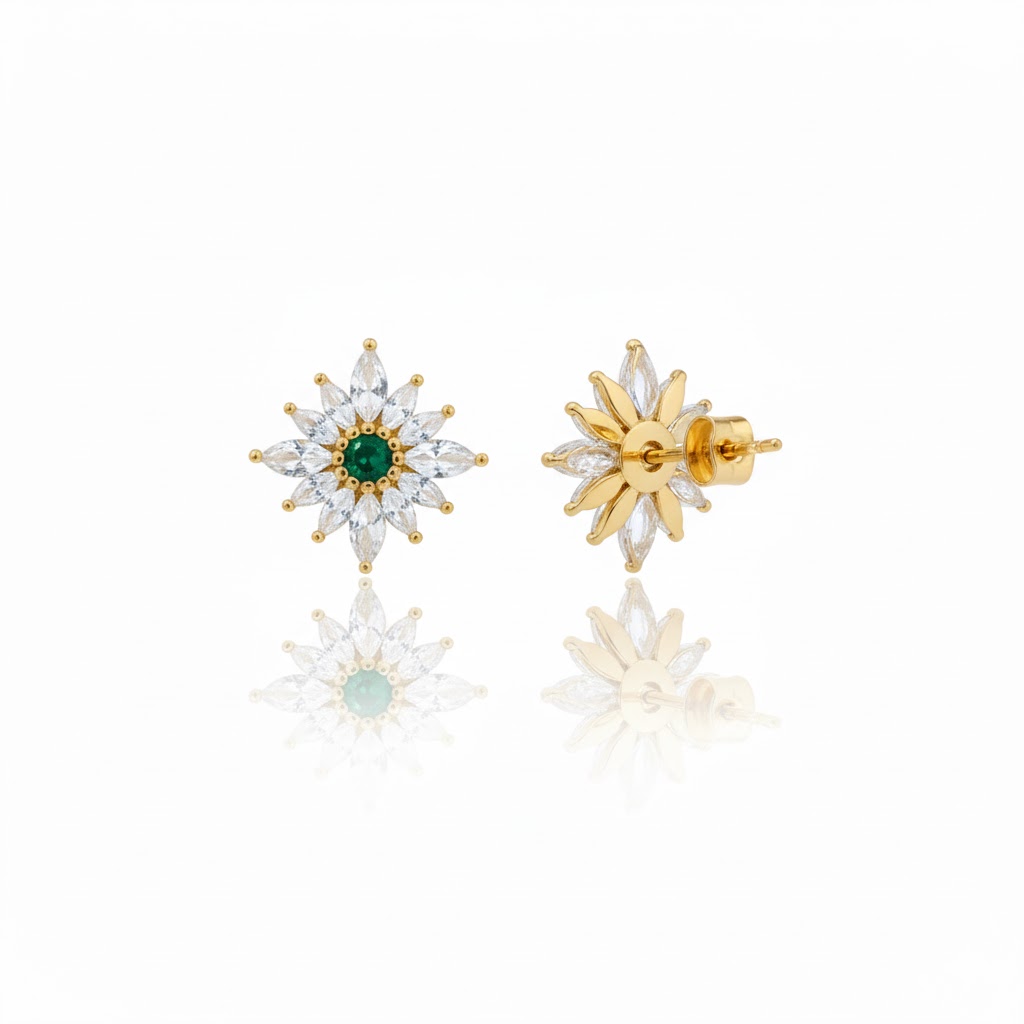 ダイヤが星のように輝くデザインに、エメラルドを中央に配置した高級ピアス。華やかさと気品を兼ね備えた一品。