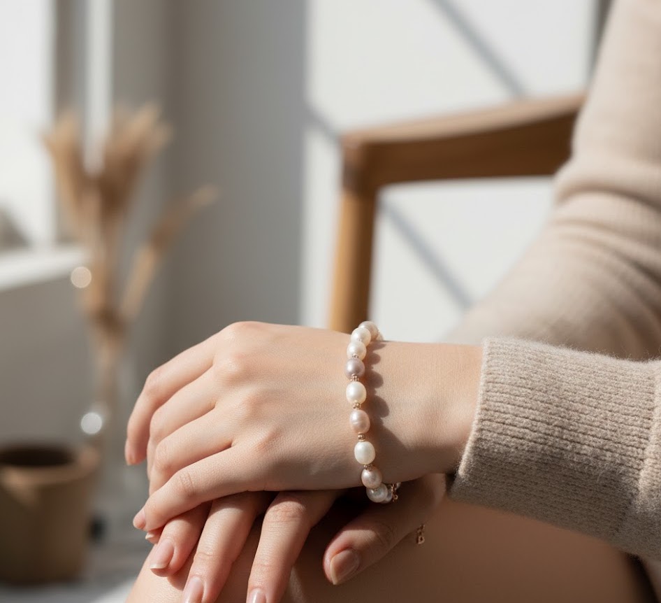 マルチカラーの淡水パールが連なるK18ローズゴールドブレスレット。柔らかな色合いが魅力。