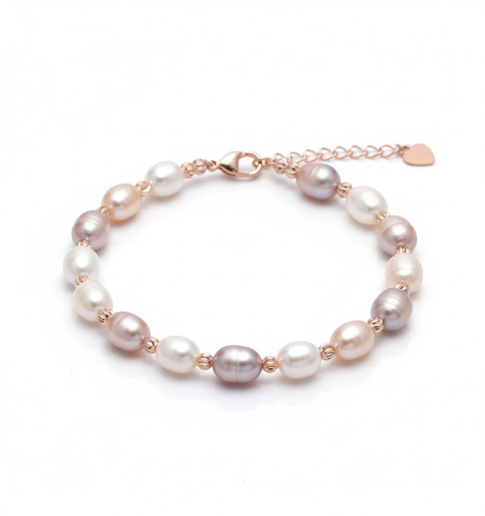 ピンク、ラベンダー、ホワイトなど、天然カラーの淡水パールをランダムに配した優美なブレスレット。K18ローズゴールドのチェーンが柔らかな色調のパールを引き立て、手首に上品な華やかさを添えます。丸みを帯びたパールの形状が一つひとつ異なり、自然の個性が楽しめる逸品。エレガントなデザインで、フォーマルにも日常使いにも最適です。